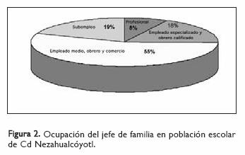 Ocupación del jefe de familia. El mayor porcentaje 55.74% correspondió al grupo de obrero, empleado medio y comercio en pequeño; en 17.5% a empleado especializado y obrero calificado y en proporción semejante 19.1% al subempleo. Sólo 7.66% de la muestra corresponde a empleo de nivel profesional.