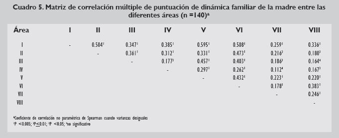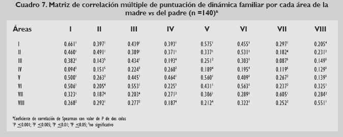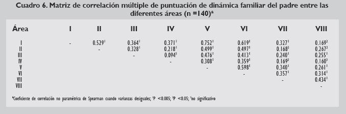 El análisis de varianza entre áreas de la dinámica familiar de papá vs mamá mostró variabilidad significativa entre las áreas recíprocas de ambos padres (ANOVA, P <0.005). Sin embargo, en la mayoría el grado de correlación fue significativo. El área I tuvo la mayor correlación con las demás áreas que el resto (P <0.005). En la mayoría de los casos, el grado de correlación entre las diferentes áreas de los papás y de las mamás fue significativo (Cuadros 5 y 6). Destacaron por ausencia de correlación: área III del padre vs área II y VIII de la madre; área IV del padre vs área I, II,VII y VIII de la madre (Cuadro 7).