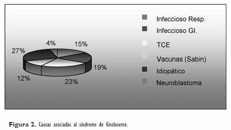 Dentro de las etiologías relacionadas a la aparición del SK se encontró en primer lugar las causas infecciosas, asociadas a cuadros gastrointestinales y respiratorios en las dos semanas previas al inicio de los síntomas, lo cual representa aproximadamente un tercio de los pacientes. Además se encontró que 23% de los mismos tenían un antecedente de trauma craneoencefálico leve, sin especificar el tiempo de evolución. En tres pacientes se consignó el antecedente de vacunación con Sabin, un día, dos días y dos semanas antes del inicio de los síntomas de SK, que se traduce en 11.5% de los casos. En 27% de los casos no se consignó algún antecedente patológico relacionado al inicio de los síntomas que puede estar en relación a un origen idiopático de la enfermedad y sólo un paciente fue diagnosticado con neuroblastoma (Fig. 2).