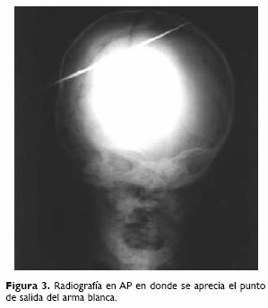Fue valorado por neurocirugía quien después de observar las radiografías (Figs. 2 y 3) decide someter a cirugía para extracción del arma blanca, hasta estos momentos sus constantes vitales y su estado neurológico se mantenían estables.