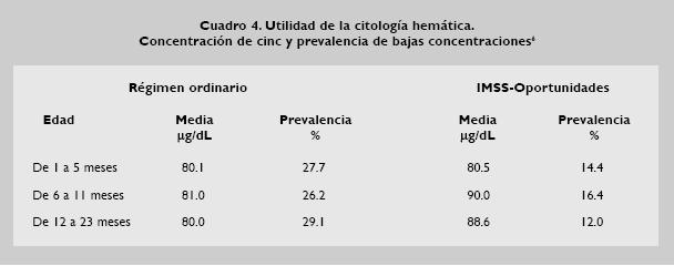 Puede observarse en los cuadros 1, 2, 3 y 4, parte de los resultados de un relevante trabajo,6 efectuado en el Instituto Mexicano del Seguro Social (IMSS), que incluyó, además de un adecuado diseño experimental, un tamaño muestral de un poco más de 30 000 niños menores de dos años de edad, representativo de toda la República, en los que se investigó, entre otros asuntos la prevalencia de anemia, así como de las deficiencias de ferritina, de ácido fólico y de cinc, en niños del Régimen Ordinario Institucional y del actual Régimen de IMSS Oportunidades. En primer lugar se quiere destacar, en los referidos cuadros, que en el Régimen Ordinario la prevalencia en los niños del grupo de uno a cinco meses de edad, para anemia fue de 9.8%, de ferritina en 6.8%, de 15.1% para la deficiencia de ácido fólico y de 27.7% para la de cinc. Que en el grupo de los de 6 a 1 1 meses fue de 20.9, 26.7, 9.3, y 26.2%, respectivamente, y que para las edades comprendidas entre 12 a 23 meses, la prevalencia fue, siguiendo el mismo orden, de 22.77, 43.6, 10.3 y 29.1 %. Cabe señalar que los niños que se atienden en el IMSS están afiliados en la Institución en el denominado Régimen Ordinario, cuya característica más relevante es que sus familias viven en zonas urbanas, marginadas y no marginadas. Cada uno de los grupos de edad mencionados son contrastados, respecto a su prevalencia de anemia y de las deficiencias señaladas, con la población que es atendida por la misma Institución, pero en el régimen de IMSSOportunidades, antes denominado IMSSSolidaridad. Aunque los resultados arrojan importantes hallazgos, no es el objetivo de este artículo, discutir acerca de ellos, sino únicamente usarlos como ejemplo de la utilidad de la determinación de la citología hemática, asociada a la determinación de otras substancias relevantes para el metabolismo.