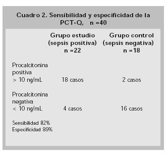 Material y métodos. Diseño: prueba diagnóstica. Se seleccionaron 2 grupos, uno con 22 pacientes con criterios de SRIS con infección bacteriana, demostrados con hemocultivos positivos (sepsis), y otro con 18 pacientes con criterios de SRIS sin infección bacteriana. Las variables estudiadas: PCTQ® con punto de corte de > 10 ng/mL y mortalidad.