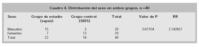 En la distribución de sexos en ambos grupos se observaron 15 casos del sexo masculino en el grupo de estudio y cinco casos en el grupo de control; del sexo femenino fueron siete casos en el grupo de estudio y 13 en el grupo de control, con un valor de P =0.01104, altamente significativo, con un riesgo relativo de 2.142857 (Cuadro 4).