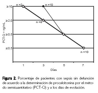 Los 10 pacientes con sepsis que sobrevivieron del grupo de estudio con PCTQ® igual o menor de 10 ng/mL, en dos de ellos el valor de PCTQ® se mantuvo en cifras iguales o mayores de 10 ng/ mL hasta el tercer día, para posteriormente presentar disminución junto con los ocho casos restantes a partir del quinto y séptimo día (Fig. 2). En este sentido, los resultados de este estudio concuerdan con lo publicado por otros autores en considerar a este marcador PCTQ®, como predictor para monitorizar la respuesta de éxito o fracaso en la terapéutica del paciente en estado crítico con sepsis en cualquiera de sus modalidades clínicas.2124