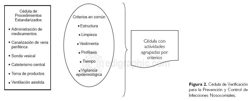 La Subsecretaría de Innovación y Calidad a través de la Dirección General de Calidad y Enseñanza en Salud desarrolló la Cédula de Verificación para la Prevención y Control de Infecciones Nosocomiales, como una contribución a la atención médica efectiva.3,69 Diversos estudios han identificado como factores de riesgo y fuente de infección nosocomial a diversos procedimientos básicos en la atención médica: administración de medicamentos, canalización de vena periférica, aplicación de sonda vesical, aplicación de catéter vía central, toma de productos y ventilación mecánica asistida; por lo que en función de tener actividades y criterios en común, la Cédula de Verificación es una herramienta que permite evaluar las actividades agrupadas por criterios. Este instrumento fomenta una cultura de prevención mediante el control y monitorización de la adherencia a los procedimientos básicos en servicios de alto riesgo en la presentación de infecciones nosocomiales, además de promover el desarrollo de proyectos de mejora.3,10,11
