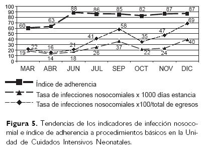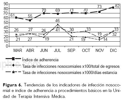Resultados. En cada servicio evaluado hubo adherencia deficiente a los procedimientos básicos en cuanto a medio ambiente, material, método y mano de obra. Durante el período de estudio, el cambio en la tasa de infecciones nosocomiales por 100 egresos fue lento y variable. En la Terapia Médica, la tasa inició con 21% y finalizó con 32%; en la Terapia Quirúrgica inició con 29% y culminó con 5%; y en la Unidad de Cuidados Intensivos Neonatales inició con 19% y concluyó con 40%.