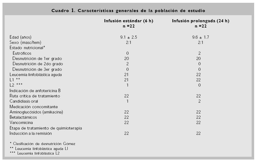 Pacientes. Cuarenta y cuatro pacientes con diagnóstico de leucemia linfoblástica aguda fueron ingresados al estudio. Veintidós pacientes recibieron anfotericina B en infusión estándar e igual número de pacientes en infusión prolongada. Las características generales al ingreso de ambos grupos fueron comparables (Cuadro 1). Igualmente, los parámetros de laboratorio básales al ingreso de los pacientes que recibieron la anfotericina B en infusión estándar no fueron diferentes a los de los pacientes del grupo de infusión prolongada (Cuadro 2). En todos los casos los pacientes recibieron anfotericina B por 14 ó más días. En sólo dos casos (uno en cada grupo) se demostró fehacientemente la presencia de Candida sp (ambos en muestras de cavidad bucal).