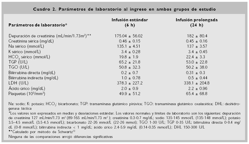 Al analizar la depuración de creatinina en el grupo de infusión estándar, no se observó disminución en el control de los días 3 y 5 [de 175 ± 56 mL/min (basal) a 166 ± 52 mL/min; P =0.19]; sin embargo, los controles de los días 7 y 14, y del día 21 mostraron una clara disminución en la depuración de creatinina de 175 ± 56 mL/min (basal) a 165 ± 52 (P =0.01) y a 151 ± 49 mL/min (P =0.02), respectivamente.