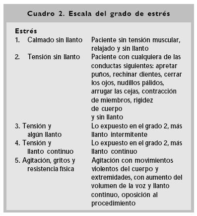 En el estudio se utilizaron dos escalas: la del dolor y la del estrés. La escala del dolor (Cuadro 1) fue diseñada por los autores y sólo considera cinco grados de dolor, según la apreciación subjetiva del paciente. La escala del estrés, también de cinco grados (Cuadro 2), está basada en la subescala de distrés de la Behavioral Approach Avoidance and Distress Scale, y su validación se describe líneas abajo.