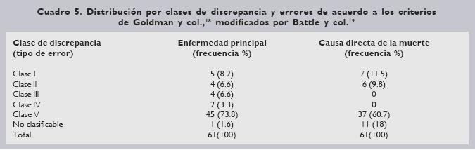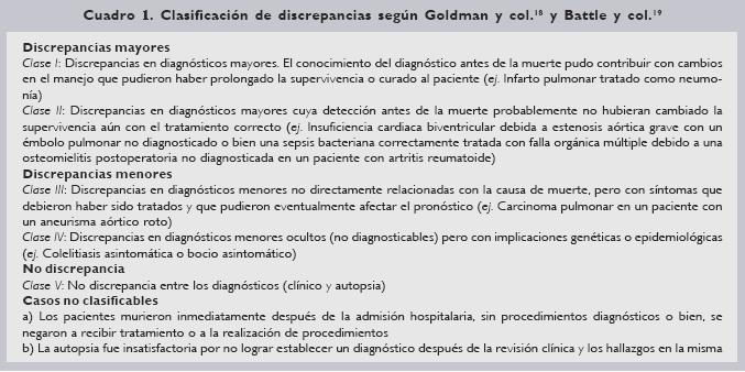 En 1999, Mort y Yeston20 evaluaron de forma retrospectiva la discrepancia diagnóstica, subdividiéndola de acuerdo al método de Goldman modificado por Battle. Evaluaron 149 pacientes, de éstos, 23% tuvieron errores clase I y 59% no tuvieron discordancia, encontraron discrepancia en 88 de 149 pacientes (59%).1820 En general, las discrepancias en las autopsias se presentan en una proporción considerable: errores clase I en 7 a 13% y errores clase II en 15 a 25% del total.