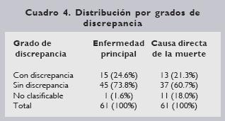 Las discrepancias mayores según la enfermedad principal se presentaron en 14.85% de los casos, y en 9.8% hubieron discrepancias menores, para un total de 24.6%. Las discrepancias en la causa directa de la muerte fueron de 21.3%, similar a lo que se ha reportado internacionalmente (Cuadro 7).