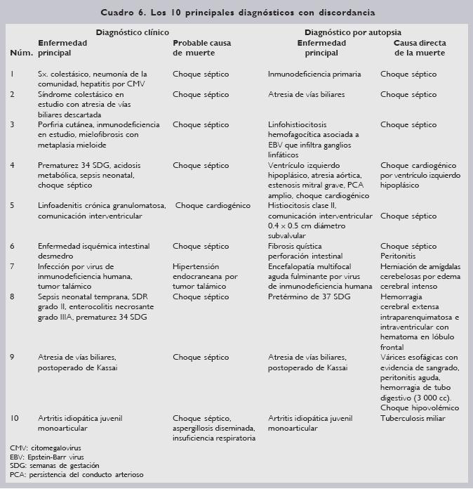 Los 10 principales diagnósticos donde se encontró discordancia se refieren en el cuadro 6.
