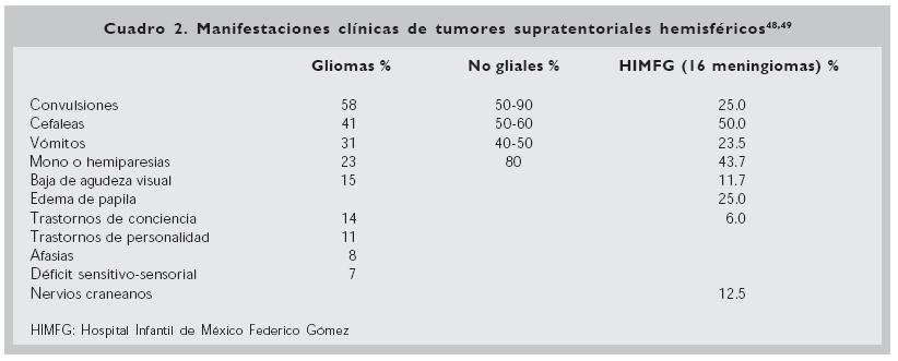 Esta revisión clínica de la serie de TIC es aún pequeña. En el caso de los supratentoriales, hay un grupo de meningiomas (Cuadro 2), donde las convulsiones significaron apenas 25% del total (n =16). Pensamos que un análisis clínico más detallado del total de los TIC dará una cifra parecida a la de Mapstone48 y Pollack,49 de 50 a 90%. El edema de papila, no informado por estos autores, se encontró en 25%, y las afecciones diversas a nervios craneanos en 12.5%.