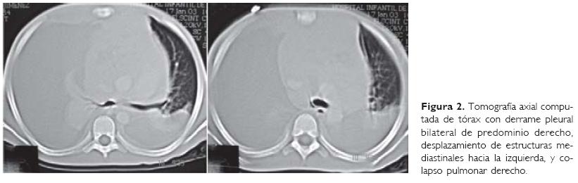 La tomografía axial computada (TAC) del tórax mostró derrame pleural bilateral de predominio derecho, desplazamiento de estructuras mediastinales hacia la izquierda, colapso pulmonar derecho y tumoración en el mediastino anterior (Figs. 2 y 3). El ecocardiograma mostró derrame pericárdico moderado sin colapso diastólico. Se realizó punción pleural derecha de la que se obtuvieron 1 800 mL de líquido serohemático. El estudio citoquímico mostró proteínas 5.1 g/dL, glucosa 105 mg/dL, densidad 1.005 mOsm y el estudio cito lógico se informó como "sugestivo de infiltración por leucemia/linfoma". La biopsia de ganglio axilar se difirió ya que el paciente presentaba hipotensión. Se agregó al manejo adrenalina, 0.5 µg/kg/min. Por la presencia de distermias se iniciaron dicloxacilina a 200 mg/kg/día y amikacina a 22.5 mg/kg/día.