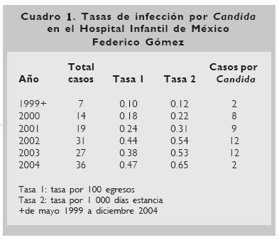 Results. We observed an increase in the rates of infection per 1 000 discharges from 1999 to 2004. We observed 45 infectious events due to Candida sp., with a mortality of 35.5%. We did not identify the species in 18 patients, C. albicans in 16 events and other non albicans in 24%. In 12 patients the underlying diagnosis was cancer; gastrointestinal malformations in 6, congenital heart disease in 12 patients, malformations of digestive tube and sepsis in 6, congenital cardiopathy and renal failure in 3, hepatic diseases in 4 and others disease entities in 10 patients. In 88.8% the infections were of nosocomial origin. The age group with the highest mortality was newborns. The main factors associated with mortality were: the antecedent of thrombocytopenia and neutropenia, as well as being intubated at the moment of the infection.