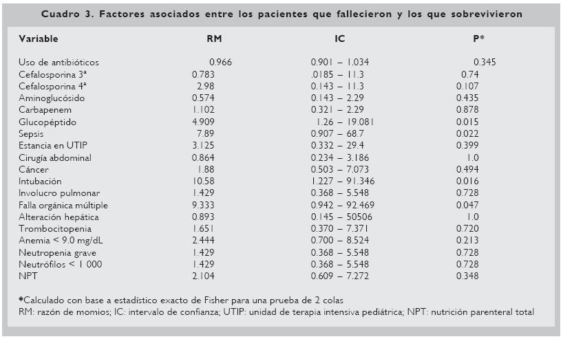 En el cuadro 3 se muestran los factores asociados entre los pacientes que fallecieron y los que sobrevivieron.