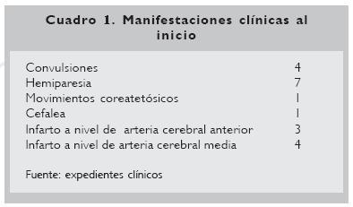 Con relación a la forma de presentación de esta entidad, en los pacientes de este trabajo la manifestación clínica inicial fue la hemiparesia asociada a infarto isquémico, de la misma manera que lo reportó Kuroda y col.4 en su estudio de 55 casos, de los cuales 32 eran menores de seis años y tenían una incidencia más significativa de infarto isquémico. Otro signo menos frecuentemente observado en nuestros pacientes fue la corea, presente sólo en un caso, donde no constituyó la manifestación inicial. Hong y col.16 sí reportan un caso de hemicorea como manifestación inicial, evidenciando una hipoperfusión cerebral a nivel del territorio de la carótida interna, corroborada por tomografía con emisión de positrones.