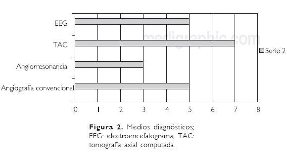 Material and methods. Retrospective and descriptive study. We retrospectively reviewed the medical records of 10 children with this diagnosis; 7 with the established criteria; 3 were excluded for not counting with angiographic conventional and angioresonance for their diagnosis. Demographic and personal information, clinical manifestations, diagnostic studies, treatment and evolution were recorded and the cases analyzed using descriptive statistics.