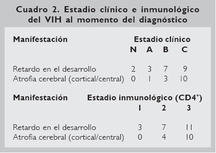 Es en el momento del nacimiento del paciente cuando el manejo médico ofrece los mayores beneficios; por lo tanto, el retardo en el diagnóstico empobrece el pronóstico, ya que el inicio del tratamiento es también aplazado.11 Las manifestaciones, desde el punto de vista clínico, se observan como una encefalopatía difusa.12-18 Según el perfil evolutivo del VIH, el compromiso encefalopático puede ser progresivo o estático. La encefalopatía progresiva, de acuerdo a la velocidad de progresión y gravedad de compromiso de su desarrollo en el SNC, puede ser subdividida en encefalopatía subaguda y lentamente progresiva.19-22 En algunos estudios, se comenta la posibilidad de una tríada característica de esta encefalopatía: retardo psicomotor, signos piramidales y disminución del aumento del perímetro cefálico.23-28