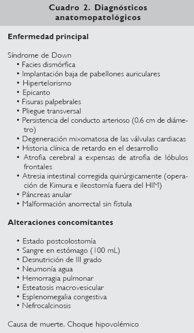 Hubo un reporte de polihidramnios por ultrasonido a las 28 semanas de edad gestacional (SDG), el cual se ha asociado en 43% de los casos a fetos anormales. La obstrucción intestinal proximal al ligamento de Treitz es la causa hasta en 47%. Singh y col.1 publicaron un artículo que hace referencia a las malformaciones gastrointestinales más comunes en el SD que son la malrotación intestinal en 71%, atresia duodenal en 57%, además de ano imperforado, divertículo de Meckel, enfermedad de Hirschsprung y gastrosquisis. Nuestra paciente tuvo diagnóstico de envío de atresia intestinal tipo III y malformación anorrectal sin fístula, por lo que se practicó anastomosis tipo Kimura y colostomía, encontrándose además malrotación intestinal. Desconozco la longitud del segmento resecado, dato importante ya que la morbilidad se incrementa con las obstrucciones más distales, sobre todo cuando se involucra la válvula ileocecal, lo que produce malabsorción y proliferación bacteriana en el intestino delgado. La mortalidad se ha asociado a neumonía o sepsis, principalmente en el período postoperatorio, la cual es más frecuente en el caso de la atresia intestinal tipo IIIb. Presentó ruptura prematura de membranas a las 36.5 SDG sin trabajo de parto y fue obtenida por vía abdominal con peso de 2 570 g, y talla 49 cm, con cálculo de Capurro de 40 SDG, lo cual no corresponde a la edad gestacional antes reportada. Desconozco si la primera medición se realizó a través de la fecha de última menstruación o bien por medio de ultrasonido, ya que se ha demostrado que la medición del diámetro biparietal es un predictor más preciso que la fecha referida.