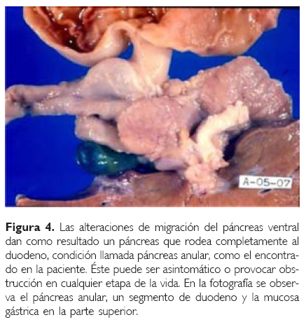 En el corazón hubo PCA y degeneración mixomatosa de las válvulas cardiacas (Fig.3).En la cavidad abdominal se encontró páncreas anular (Fig. 4), hepatomegalia y esplenomegalia congestiva, y 100 mL de sangre en el estómago. Además de las bocas de colostomía, la proximal a 45 cm de la válvula ileocecal, y la distal a 12 cm del recto, se encontró malformación anorrectal sin fístula y ano imperforado. Recientemente se ha descrito un aumento en la incidencia de alteraciones gastrointestinales en niños con SD,6,7 éstas se pueden englobar en tres categorías, las embriológicas o estructurales, las de motilidad y coordinación, y las autoinmunes (Cuadro 1). Nuestra paciente presentó alteraciones de las consideradas en el primer grupo con atresia intestinal, páncreas anular y ano imperforado. Usualmente, estos pacientes tienen excelente evolución después del tratamiento quirúrgico. En los pacientes con enfermedad de Hirschsprung, es indispensable excluir el diagnóstico de ano imperforado, y se considerará esta enfermedad cuando el niño con SD presente por más de 24 horas meconio, y aunque se presenta en forma temprana, hasta 50% de los niños con enfermedad de Hirschsprung y SD presentan síntomas después del primer mes. El diagnóstico se hará por medio de biopsia colónica.7,8