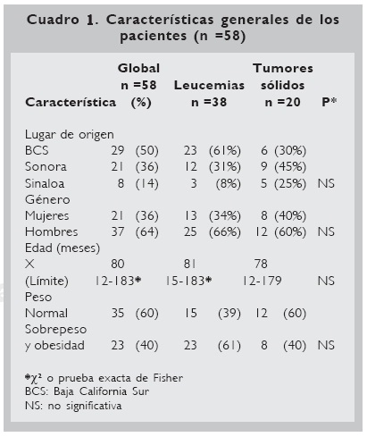 Participaron cincuenta y ocho pacientes, 38 con leucemia aguda y 20 con tumores sólidos, con predominio de los varones (64%) sobre las mujeres (36%), procedentes en su mayoría (50%) del estado de Baja California Sur, con una edad promedio general de 80 meses (6.7 años).