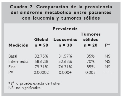 La prevalencia global del síndrome metabólico se incrementó de la medición basal a la final en 142%, sin encontrar diferencia estadística de acuerdo a neoplasia, tal y como se puede observar en el cuadro 2.