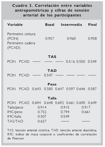 Sin embargo, se encontraron diferentes grados de asociación entre las variables antropométricas y las cifras de tensión arterial de los participantes, lo que se muestra en el cuadro 3.