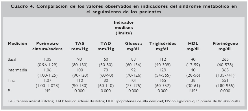 En el cuadro 4 se presenta la comparación entre los valores observados en los indicadores del síndrome metabólico durante el tiempo de seguimiento del estudio, llamando la atención la diferencia mostrada en la mayoría de ellos.