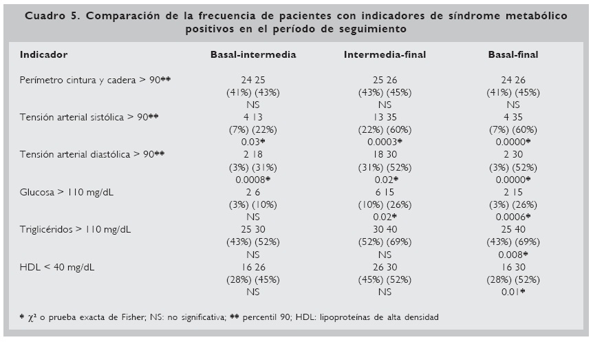 Finalmente, se realizó la comparación a través de la prueba de χ2 o la prueba exacta de Fisher del número de pacientes que manifestaron positividad en los indicadores del síndrome metabólico en cada una de las mediciones, lo que se puede observar en el cuadro 5.