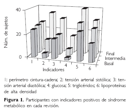 Results. Fifty-eight patients participated. The global prevalence of the syndrome was 32.75 at the beginning, and 79.31% at the end. The 3 measurements were different for syndrome indicators as well as the number of positive patients (P <0.05). Blood pressure, height and weight were moderately associated with waist and hip perimeters.