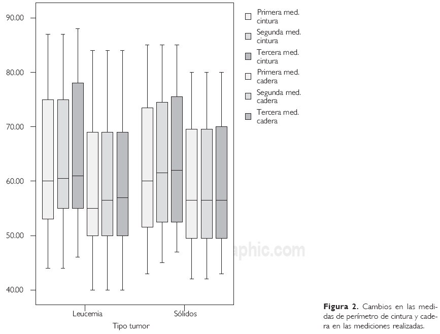 Las figuras 2 y 3 ilustran el fenómeno anterior, haciendo notar el incremento en las medidas antropométricas de los participantes de acuerdo al tipo de neoplasia.