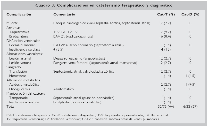 Septostomía atrial médica tipo Rashkind: esta intervención fue la más frecuentemente empleada, siendo su indicación la presencia de hipoxemia grave. Se practicó en 47 casos con diagnóstico de TGA del total de 73 procedimientos (64.5%). Los primeros 22 fueron intervenidos con catéteres Rashkind-Miller (Baxter-Edwards, Irving Ca.) 5-F, que necesitaban vainas 7-F para su introducción y cuyos globos eran de gran dimensión; en los tratados posteriormente a 1996 (25 casos), se utilizaron catéteres "no complacientes" (no deformables) Z-5 (NuMed, Canada Inc.) con calibres de 4 ó 5F, que por su menor diámetro representaban una menor posibilidad de complicaciones tales como la obstrucción circulatoria del atrio izquierdo o daño vascular. Esta última complicación ocurrió en sólo uno de los casos iniciales con desgarro de vena femoral que tuvo que ser reparada quirúrgicamente. La indicación de la septostomía fue descomprimir al atrio izquierdo y establecer un cortocircuito de izquierda a derecha, mejorar la oxigenación sistémica y el gasto cardiaco sistémico como puente a una corrección quirúrgica posterior. De las 47 septostomías en TGA, en 26 se trató de la variedad simple, ocho se asociaron a persistencia del conducto arterioso (PCA), siete a comunicación interventricular (CIV), dos con CIV y PCA, dos con CIV y coartación aórtica (CoAo) y dos a obstrucción al tracto de salida del ventrículo izquierdo. Los criterios de mejoría en este grupo se basaron en: aumento de la saturación sistémica, aumento del diámetro de la comunicación interauricular (CÍA) y disminución del gradiente transatrial, los que se lograron en todos excepto en uno que tuvo que ser recateterizado al mes de edad para llevar a cabo una septostomía con navaja (técnica de Park); 15 casos (20.5%) presentaron algún tipo de complicación, 11 de ellas mayores (Cuadro 2). Un RN de 22 días de vida con TGA simple desarrolló tamponade inmediatamente después a la septostomía con necesidad de drenaje pericárdico urgente, recuperándose sin secuelas. Otro de 15 días de edad con TGA y PCA pequeño con desaturación intensa desarrolló edema pulmonar y falleció en la sala de hemodinámica. Ambos casos ocurrieron al inicio de la experiencia, utilizando catéteres Rashkind-Miller, 32 de los 47 pacientes (79.5%) no presentaron complicación alguna.