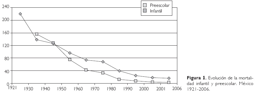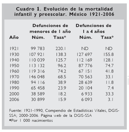 Según los datos que se muestran en el cuadro 1, es evidente el avance registrado en el país en los últimos 85 años, período durante el cual se observa un descenso continuo y sostenido de los niveles de mortalidad tanto para la población de memores de un año como para el grupo de uno a cuatro años. Mientras el indicador para menores de un año representaba en 1921 una tasa de 220 defunciones por cada 1 000 nacimientos, ésta desciende en el año 2006 a 15.9. De manera semejante, el grupo de edad preescolar (de uno a cuatro años) desciende de una tasa de 156 defunciones por cada 1 000 nacimientos en 1930 a sólo 3.1 en el año 2006.