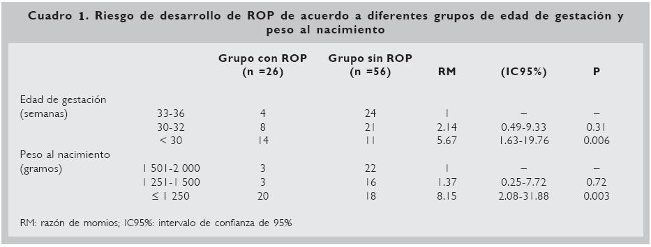Resultados. Los prematuros con EG menor de 30 semanas (razón de momios [RM] =5.67, intervalo de confianza de 95% [IC95%] =1.63-19.76) y PN igual o menor de 1 250 g (RM= 8.15, IC95% =2.08-31.88) tienen mayor riesgo de desarrollar ROP, comparado con pacientes de EG de 33 a 36 semanas y PN de 1 500 a 2 000 g, respectivamente (P <0.01).