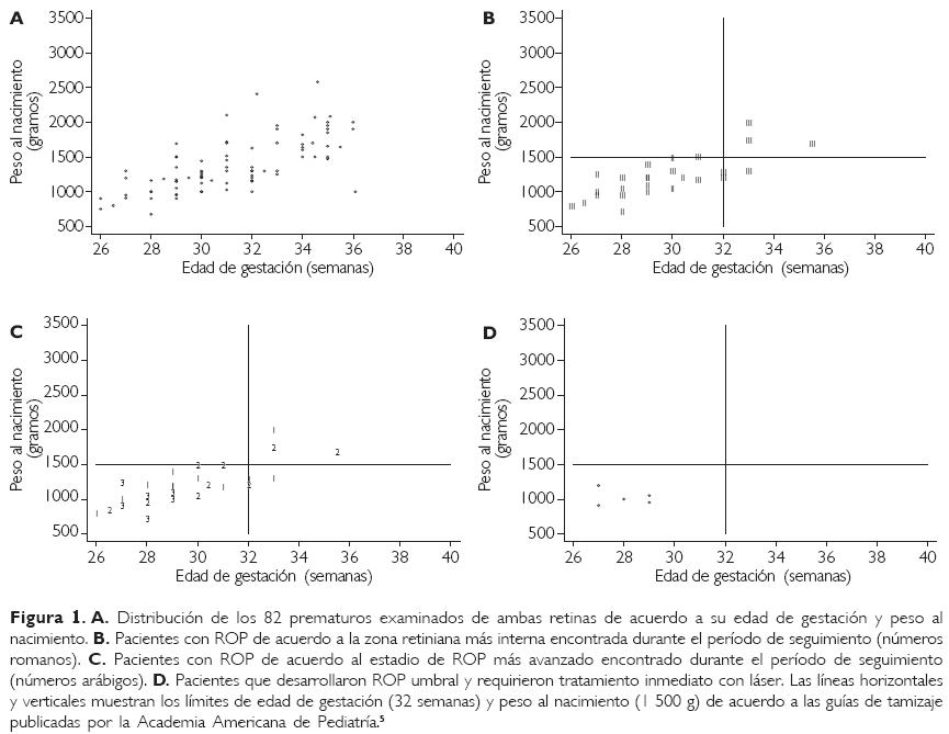 La identificación y tratamiento oportuno de prematuros en riesgo es imprescindible para evitar el desarrollo de ceguera. La adecuada evalUación del fondo de ojo en pacientes prematuros, ha permitido disminuir la incidencia de ceguera en países industrializados. De acuerdo a la primera guía de tamizaje de ROP emitida por la Academia Americana de Pediatría (AAP), los pacientes prematuros con edad de gestación (EG) igual o menor de 32 semanas y peso al nacimiento (PN) menor de 1 500 g, tienen riesgo de desarrollar retinopatía umbral y desprendimiento de retina, y por tanto daño visual irreversible.3 Muchos países desarrollados han emitido sus propias guías de tamizaje basadas en la EG y PN. Sin embargo, cuando estas guías han sido aplicadas en países en vías de desarrollo, muchos pacientes han sido subestimados.4 Hasta la fecha, en México, no ha sido publicada ninguna guía de tamizaje en la Norma Oficial Mexicana para la Atención de la mujer durante el embarazo, parto y puerperio y del recién nacido.5