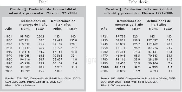 En el artículo que se publicó en el número 2 del Boletín Médico del Hospital Infantil de México 2008; vol. 65, correspondiente a los meses marzo-abril en la sección de Estadísticas Vitales: Mortalidad infantil y preescolar en México, 1921-2006. En el cuadro 1 de la página 154 la tasa correspondiente al año 2000