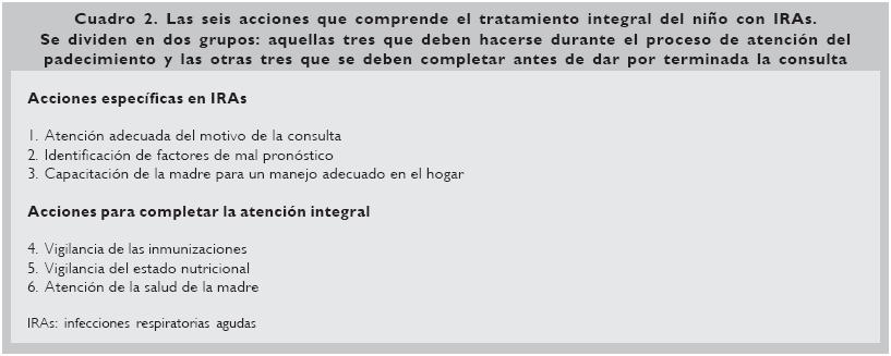 En la guía 2, en primer lugar, encontramos un recuadro grande en el que se describen a detalle las medidas generales, los factores de mal pronóstico17 y los temas en los que hay que educar a la madre para el manejo adecuado de las IRAs en su hogar, y los signos de alarma para la detección temprana de una posible neumonía. Todo lo anterior debe hacerse a cuanto niño vaya a consulta. Si se decide tratamiento ambulatorio, debe de aprovecharse la consulta para, además de las acciones específicas en las IRAs, realizar las otras tres acciones que son necesarias para considerar el componente "integral" o completo de una consulta pediátrica de excelente calidad (Cuadro 2). Así, una buena consulta pediátrica debe abarcar siempre estas seis acciones señaladas en el cuadro 2.18