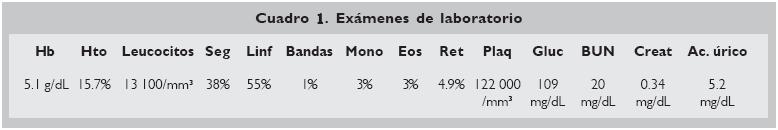 Se le realizó un aspirado de médula ósea que mostró datos de proceso reactivo sin evidencia de infiltración neoplásica. Hemocultivo positivo para bacterias grampositivas, Comamonas acidovorans. Se le dio manejo con cefotaxima a 150 mg/kg/ día. Tomografía axial computada (TAC) de tórax y abdomen con adenomegalias hiliares, hepáticas y esplénicas. Un nuevo aspiradobiopsia de médula ósea mostró hiperplasia de la serie roja; megacariocitos aumentados, numerosos monocitos e histiocitos activados, y solo uno con hemofagocitosis. Mielocultivo negativo. Los resultados de los exámenes de laboratorio se muestran en el cuadro 1.
