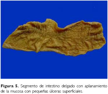 En la autopsia, se observaron datos de desnutrición con peso de 7 800 g vs 9 320 g, pero la talla estaba conservada (71 cm). El hígado aún se encontraba aumentado de tamaño (500 g vs 304 g) (Fig. 3), así como el bazo (108 g vs 26 g), y se encontraron adenomegalias múltiples en mesenterio, retroperitoneales, mediastino y cuello. En todos elloshabía grupos de histiocitos de Langerhans (Fig. 4). El hígado, además, mostraba esteatosis difusa de gota gruesa. La médula ósea era hipocelular, por efecto de la quimioterapia, pero no había células neoplásicas. Había dilatación de las asas del intestino delgado y grueso, la mucosa mostraba pequeñas zonas de necrosis y ulceración, y leve incremento del infiltrado inflamatorio linfocitario acompañado de edema y congestión. En la lámina propia había, además, bandas de contracción (Figs. 5 y 6). Estos datossonde enterocolitis aguda, probablemente infecciosa, más que de enterocolitis neutropénica. Secundario a esta enterocolitis se encontraron datos de deshidratación, manifestados por dilatación y retención de secreciones en los conductos de las glándulas mucosas del aparato respiratorio, glándulas salivales y páncreas (Fig.7). Tambiénse observaron datos de choque, manifestado en pulmones como daño alveolar difuso con edema alveolar con membranashialinas,congestión capilar y hemorragia focal (Fig. 8), y en riñones necrosis tubular aguda. En el sistema nervioso central había datos de atrofia leve, el encéfalo pesó 750 g vs 1 000 g. Microscópicamente se encontró datos de encefalopatía hipóxica aguda, pero lo más llamativo fue una degeneración espongiforme de la sustancia blanca periacueductal, probablemente secundaria a la quimioterapia (Fig. 9).