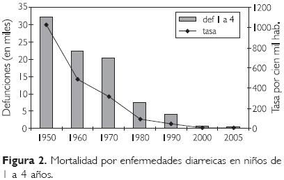 Como puede observarse en el cuadro 1, las defunciones registradas durante 1950 en menores de cinco años fueron casi de 58 mil, con una tasa de 1 453 niños fallecidos por cada 100 mil habitantes de ese grupo de edad. Dichas cifras implicaron que 29 de cada 100 muertes ocurridas en ese grupo de edad, lo fueran por alguna enfermedad diarreica. La tendencia descendente fue continua, de tal forma que en el año 2005 el número de muertes fue de 1 829, y la tasa de 18.6.