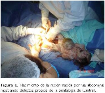 Case report. Female newborn delivered at term, product of the 4th pregnancy from a 36 yearold mother with history of smoking and alcoholism, asthma treated with salbutamol during pregnancy, urogenital tract infection treated, preeclampsia in the 4th month of gestation nontreated. Diagnosis by ultrasound at 35.2 weeks of pregnancy of omphalocele and ectopia cordis; abdominal delivery of the newborn with the defects described above, associated with intracardiac lesions: pulmonary atresia, vascular transposition, ventricular septal defect and atrial septal defect. The infant died on the 5th day.