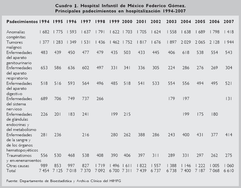 La información que ahora se presenta, está sustentada en el seguimiento del registro de la actividad hospitalaria en el Hospital Infantil de México Federico Gómez (HIMFG) en el período 1994-2007; para ello, los diagnósticos fueron organizados según los grandes capítulos de la Clasificación Internacional de Enfermedades (novena revisión hasta 1997 y décima a partir de 1998). Cabe señalar que, si bien, se considera que se produce un alta de hospital cada vez que un paciente abandona la unidad médica por: fallecimiento, alta médica, alta voluntaria en contra de la recomendación médica o traslado, en esta ocasión, y con el propósito de homogeneizar las cifras en el tiempo, no se consideran los egresos por defunción.