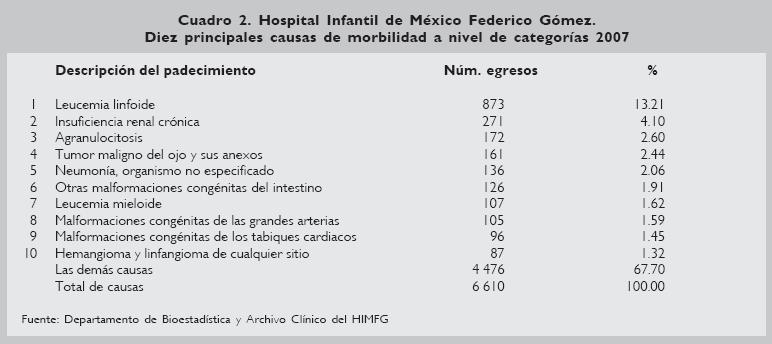 De la revisión de los motivos de egresos con un mayor nivel de desagregación, registrada durante el año 2007, se detecta que la leucemia linfoide es la causa más frecuente, seguida de la insuficiencia renal crónica y la agranulocitosis, y que en su conjunto representan 20% de los motivos de alta hospitalaria de ese año. Otras causas que aparecen dentro de los primeros lugares se refieren a las neumonías no especificadas y las malformaciones congénitas, problemas de salud crecientes en el nivel hospitalario. Cabe señalar que estas causas no son homogéneas para toda la población, sino que varían según el grupo de edad de la población atendida (Cuadro 2).