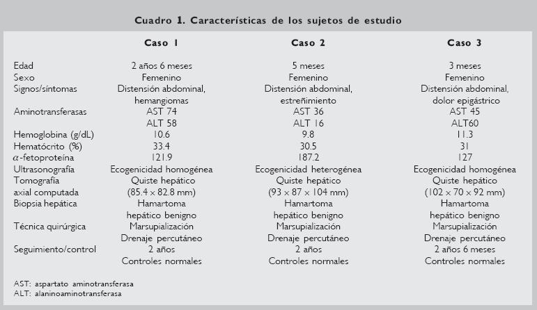 Se describe el manejo de tres pacientes en edad lactante y preescolar, que fueron diagnosticados por ultrasonido abdominal y tomografía axial computada (TAC) contrastada como tumor quístico hepático, confirmado histopatológicamente como un hamartoma hepático; fueron manejados con marsupialización externa del quiste y drenaje del contenido sin resección de tejido hepático, dejando drenaje permanente por ocho semanas. Se les realizó control tomográfico hasta evidenciar la recuperación del parénquima hepático y desaparición de la lesión quística, observando fibrosis periférica en el sitio del drenaje. En el cuadro 1 se resumen los datos clínicos de laboratorio, gabinete, histopatológicos, tratamiento y evolución.
