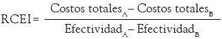 Donde la razón costo-efectividad incremental (RCEI) se obtiene de la división entre los costos totales netos (costos incrementales) y la efectividad neta (efectividad incremental) para dos tratamientos médicos alternativos (A y B) (Cuadro 1).