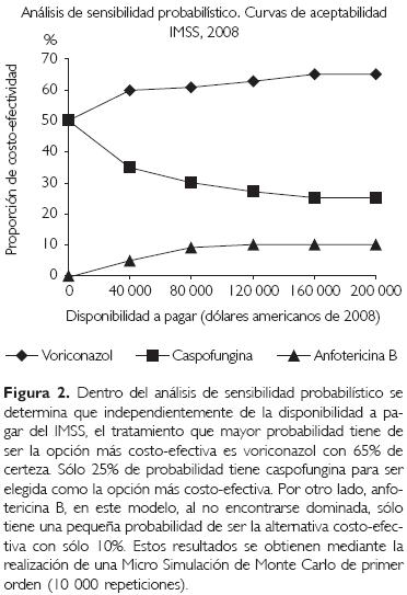 Resultados. Los costos totales promedio por paciente esperados para el tratamiento empírico de aspergilosis resultaron convoriconazol en $57 378.58 US; $72 833.96 US con anfotericina B, y de $49 962.37 US con caspofungina. La tasa de remisión total sin eventos adversos fue de 37% para caspofungina, 43.6% para voriconazol y de 51.1% para anfotericina B. El análisis de sensibilidad probabilístico muestra que voriconazol sería el tratamiento más costo-efectivo en 65% de los casos, independientemente de la disposición a pagar por el IMSS.