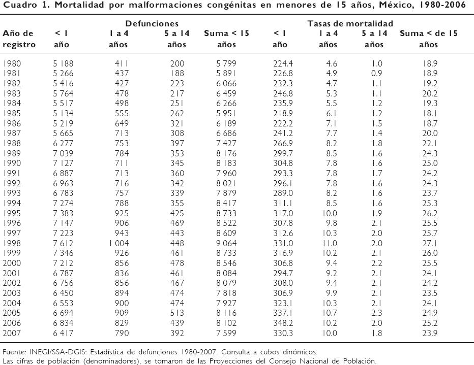 Las MC representan hoy en día la segunda causa de muerte entre la población de menores de un año (después de las afecciones perinatales), siendo la causa más frecuente las malformaciones del corazón (que representa 43.5% del total del grupo); considerando únicamente a los menores de un año, la tasa de mortalidad pasa de 224 a 337 defunciones por cada 1 000 habitantesde esa edad entre 1980 y 2007, lo que en términos del número de muerte representa un incremento de 5 188 a 6 417 durante los años antes mencionados (Cuadro 1).