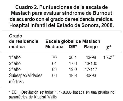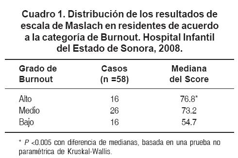 Methods. A cross-sectional study was carried out in the year 2008. To evaluate BS, the Maslach Burnout Inventory scale was applied to 58 residents. Differences in scores were assessed using the Kruskal-Wallis test.