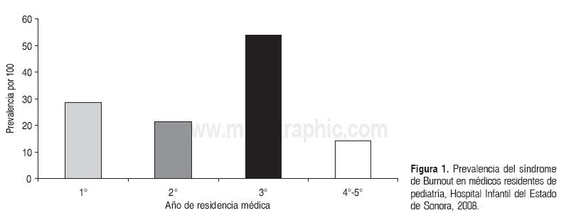 El médico residente de pediatría tiene jornadas laborales semejantes en tiempo y carga a los de otras especialidades médicas, con la dificultad profesional agregada de las características propias de los pacientes con los que lidia, lo que puede incrementar su probabilidad de desarrollar SB. Por tal razón, este estudio se propuso examinar la prevalencia del síndrome y su distribución al interior de un grupo de médicos residentes de pediatría del Hospital Infantil del Estado de Sonora (HIES), que cursaban su residencia en el año 2008.